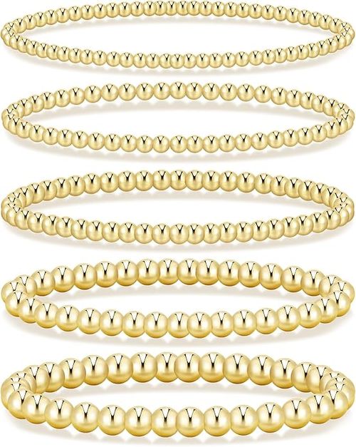 17 MILE Valentine’s Day Gold Beaded Bracelets are dainty and stylish. 💖 5-piece set, 14K gold-plated chunky stretch beads—perfect stackable gift for her, teen, or wife. 🎁💛