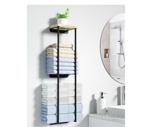 Anfeichen Wall Mounted Towel Rack! 🛁 This black metal holder features a wood shelf, two-tier storage, and a durable wall-mounted design for bathroom organization.