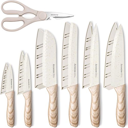 Astercook Knife Set brings precision and style to your kitchen 🔪 13 stainless steel knives, ceramic coating, and wooden handles 🍽️.
