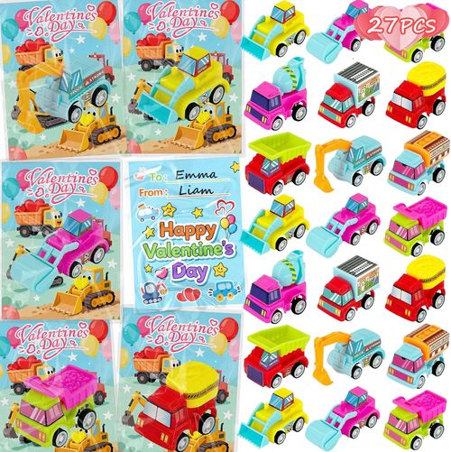 Atiger Valentine Cards. 🏎️ This 27-piece set includes colorful pull-back trucks, fun construction vehicles, and matching cards. 🎁