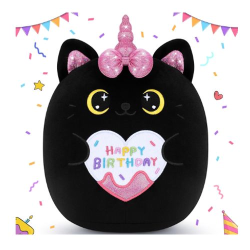 Auspicious Beginning Black Unicorn Cat Plush Toy brings kawaii magic to birthdays 🖤🦄 11-inch size, anime style, super soft cuddly comfort 🎂