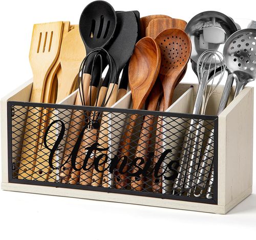 Declutter your kitchen in style! 🥄 Banawey Wooden Utensil Holder – 4 compartments, farmhouse charm. 🍴