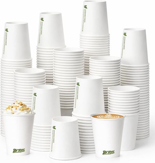 Biotakeware 8 oz Disposable Paper Cups make serving drinks easy and mess-free. ☕🥤 300-pack, sturdy leak-resistant lining, perfect for home, office, parties, and travel. 🎉