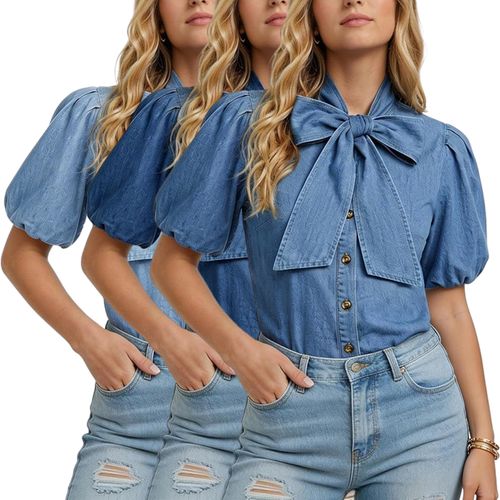 Summer chic = unlocked! ☀️ BISUAL Denim Top is all about puff sleeves, bow-tie vibes, and button-down cool—perfect for work or weekend brunch! 💙
