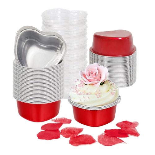 BLVRYVIO Heart Shaped Cake Pans with Red Petals add romantic baking flair ❤️🍰. 50 foil cups with lids, disposable aluminum, perfect for Valentine’s and weddings 🎉