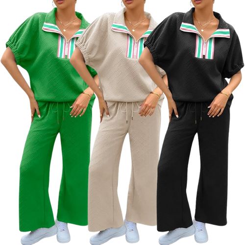 Cicy Bell 2-Piece Outfit 👚 brings a chic, textured color-block style. Half-zip puff sleeve top with cropped wide-leg pants for comfy lounge vibes 🌈💖👖.