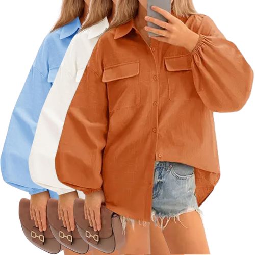 Cicy Bell Oversized Linen Button-Down Shirt π gives effortless everyday style. Puff sleeves, loose fit, and V-neck design for comfy chic! πΏππ