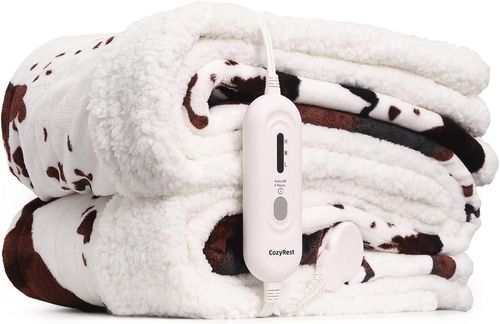 Stay warm in style! ❄️ CozyRest Cow Print Electric Blanket – 3 heat settings, soft flannel & sherpa, auto shutoff. ✅