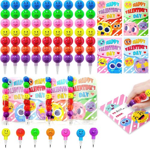 dealot Valentine Pencil Set makes classroom gifting fun. 28-pack, emoji designs, stacking pencils with cards, perfect party favors ✏️❤️🎉
