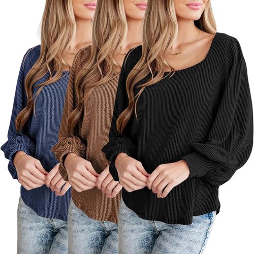 Dokotoo Square Neck Puff Sleeve Blouse is chic and comfy. 👚 Soft ribbed knit, loose casual fit, stylish puff sleeves for everyday wear. 💖🍃