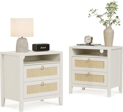 Dowinx Rattan Night Stand Set 🛏️ These pieces include integrated charging stations, dual spacious drawers, and an open storage shelf for maximum convenience. 🔋