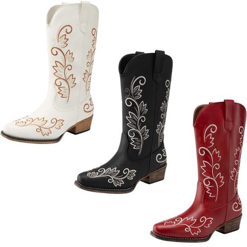 DREAM PAIRS Cowboy Cowgirl Western Boots! 🤠  Mid-calf design, square toe embroidery, and low chunky heel for comfy all-day wear! 👢💖