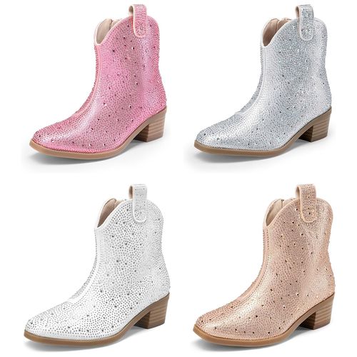 DREAM PAIRS Girls Cowgirl Boots! Sparkle with stylish western flair 🤠 Rhinestone design, low heel comfort, ankle fit; perfect dressy fun. 👢