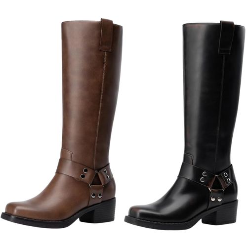 DREAM PAIRS Knee High Biker Boots elevate bold everyday style. 🥾 Pull-on design, square toe, buckle accents for confident wear.
