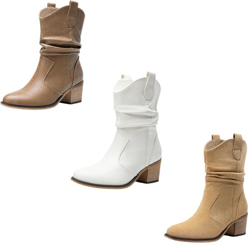 DREAM PAIRS Modern Western Cowboy Boots bring chic western flair 🤠👢 Mid-calf, round toe, chunky heel, pull-on tabs for stylish cowgirl comfort.