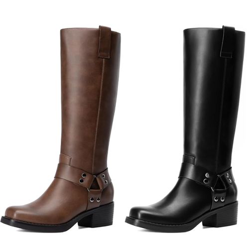DREAM PAIRS Square Toe Knee High Boots! 🏍️ These pull-on long biker boots feature a fashionable square toe design, perfect for making a statement.