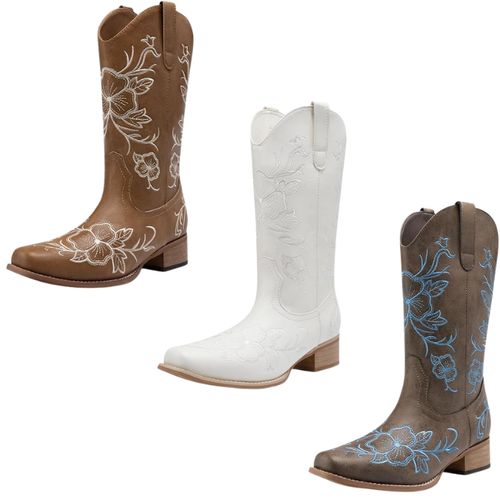 DREAM PAIRS Western Cowboy Boots elevate festival ready style. Square toe, embroidered design, chunky low heel, comfort, mid-calf, western 🤠