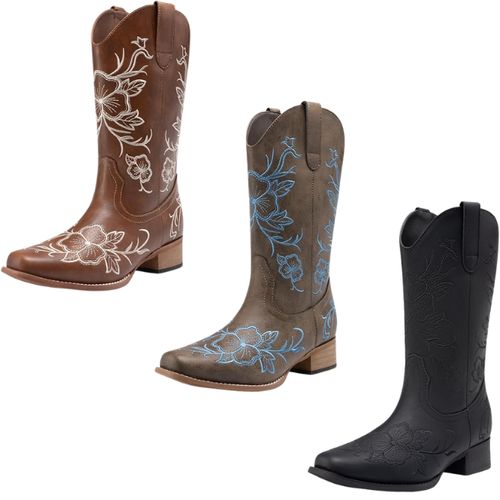 DREAM PAIRS Western Cowboy Boots 🤠 bring bold festival style! Square toe, mid-calf embroidered design, chunky low heel—perfect for country music festivals, themed parties, or concerts 💖🎶🌵.