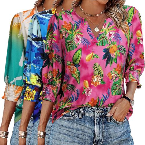 Dresswel Print Tops🌸 combine trendy style with comfy elegance! 3/4 sleeves, V-neck design, and smocked cuffs—perfect for casual days or dressy outings 💕👚.