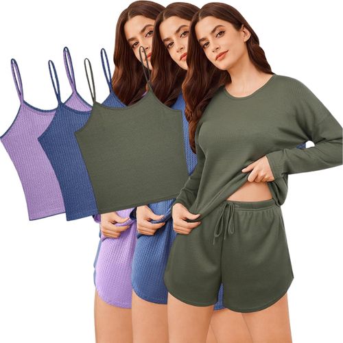 Ekouaer 3-Piece Waffle Knit Lounge Set keeps you comfy and cute! 🛋️ Long-sleeve top, cami, and shorts—perfect for lounging or sleeping!