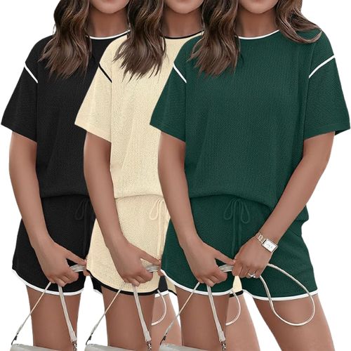 Ekouaer Knit 2 Piece Short Sets offer effortless style for any getaway. ! 🏖️ This short-sleeve lounge set features breathable, soft knit fabric.! ✨