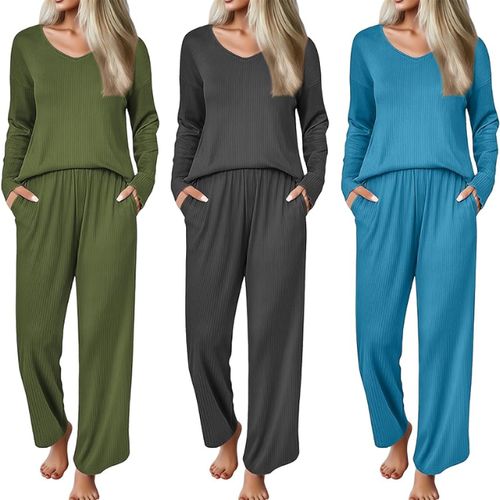 Ekouaer Womens Pajama Set offers cozy all-day comfort. 🛌 Ribbed knit, long sleeves and pants, pockets for practical lounge and sleepwear.