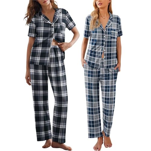 Ekouaer Plaid Pajama Set! 💤 Soft fabric, button-down top, and comfy long pants! ✨🌙