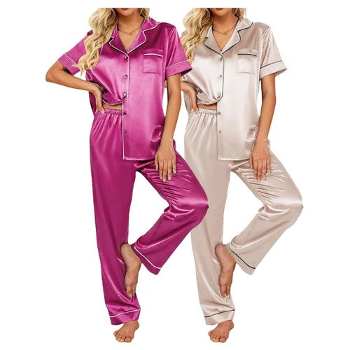 Ekouaer Short Sleeve Satin PJs Set 🌙 Smooth satin, button-down design, and perfect for lounging or sleep.
