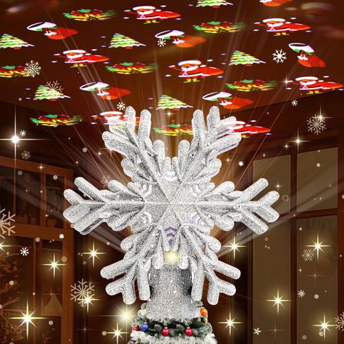 Elovonix Christmas Tree Topper adds magical holiday sparkle .Lighted, rotating projector, silver snowflake design enhances festive decor for Christmas trees 🎄❄️.