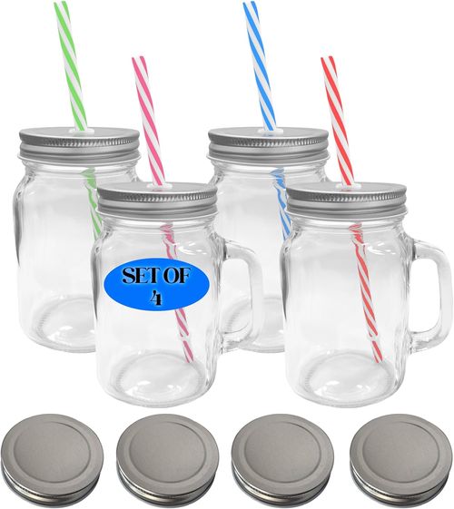Friday Feeling 16oz Glass Mason Jar Mug set (4) 🍹. Each beverage container includes a sturdy handle, a secure metal lid, and a fun striped straw! 🥳☀️