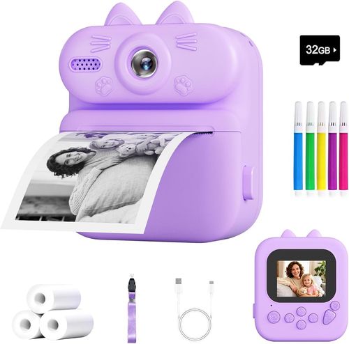 Gleeglee Kids Camera Instant Print 1080P Purple Cat sparks creative photo fun. Instant print, 32G SD, lanyard portable cute gift. 📸🐾🎁