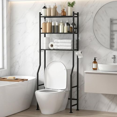 GloTika 3-Tier Over-Toilet Organizer! 🚽 Space-saving + sturdy (150lb!) + hooks & paper holder included. Say goodbye to clutter—hello, sleek & tidy! 🛁