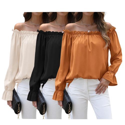 Halife Off-Shoulder Blouse 👚 ruffle trim and long sleeves with a loose fit. Perfect for casual outings 🌸, parties 🎉, and trendy look