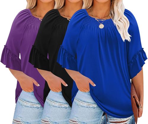 Halife Plus Size Tops 🌸 blend comfort and dressy style effortlessly! 3/4 ruffle sleeves, pleated crew neck, and flattering tunic fit in sizes XL-5X 👚💖🛍️.