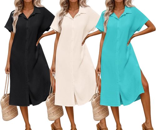 Halife Swimsuit Coverup Shirt Dress 🌊☀️ is perfect for effortless beach style! Button-down design, lightweight fabric, and short sleeves for breezy vacation vibes 🏖️✨👗.