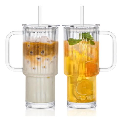 INSETLAN 26oz Ribbed Glass Tumblers bring style to every sip! 🌟 Large 2-pack, handle & lid, perfect for iced coffee, smoothies, tea, or juice on the go!