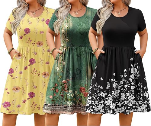 IN'VOLAND Plus Size Summer Dress 🌸👗 combines comfort and style! Short sleeves, empire waist T-shirt design, and handy pockets perfect for casual summer outings ☀️💖.