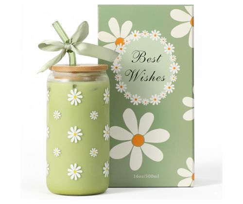 KMCCUMBER Cute Glass Matcha Cup! 🍵  Adds charm to every sip. 🌼 16oz daisy design, lid and straw included, perfect aesthetic gift for coffee and matcha lovers! 💚