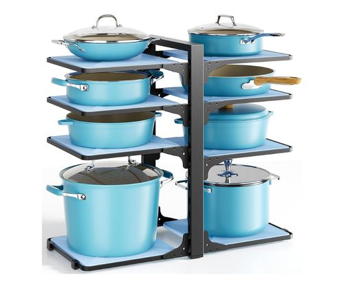 LAMU Pots and Pans Organizers 🍳 maximizes small kitchen storage effortlessly! 8-tier heavy-duty rack, 15" height design, and adjustable slots to hold cast iron pans and skillets securely 🏠🖤🔧