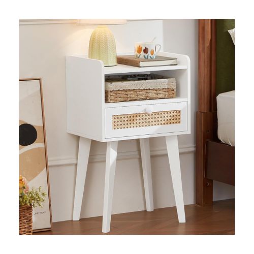 Lerliuo Rattan White Night Stand adds airy boho charm to any space. Drawer storage, open shelf display, sturdy solid wood legs. 🌿🛏️