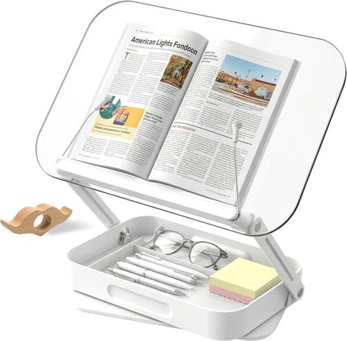 Lipcozy Adjustable Acrylic Book Stand 📖 Clear acrylic book holder with adjustable angle and page holder, 360° rotating design with storage—perfect for cookbooks, textbooks, or recipe books on the kitchen counter 💖🏡.