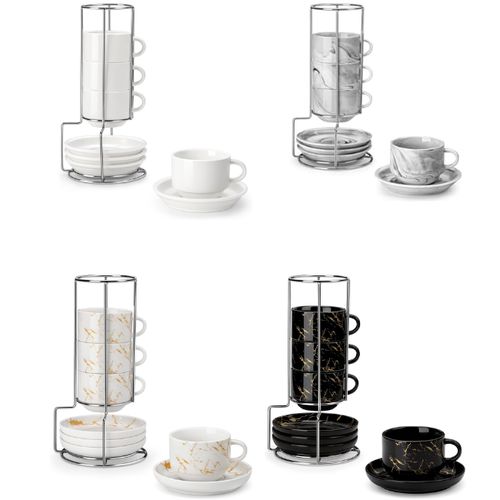 MALACASA 8 oz Porcelain Espresso Cups with Saucers elevate your coffee moments in style. ☕ Set of 4, stackable design, marble black finish with metal stand. 🖤