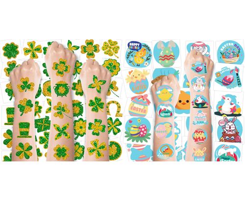 MDDRUIQI St. Patrick's Day Accessories provide a massive variety of festive options for kids and adults alike. This 100-piece set includes shamrock temporary tattoos and lucky clover stickers in green and gold. ☘️🌈
