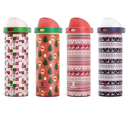 Meoky 24 oz Christmas Insulated Water Bottle keeps drinks icy cold. Leak-proof, 2-in-1 straw lid, and festive silicone base for holiday cheer. ❄️🎄💧