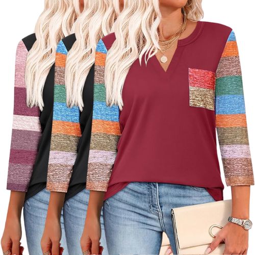 MixShe 3/4 Sleeve Split V Neck Tops are casual blouses perfect for everyday style! 👚 Color block design, lightweight fabric, handy pocket! 👜