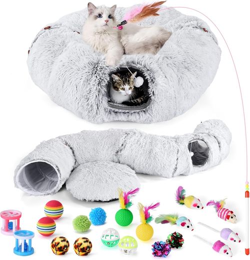 Odoland Cat Tunnel Bed creates cozy playtime for cats 🐱🖤 Indoor plush donut tunnel, detachable cave, includes 20 toys, comfy furniture 🧸