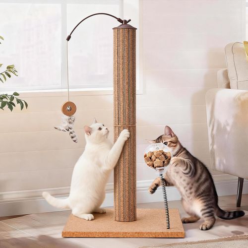 Odoland Multi-Cat Scratching Post! 😼 Durable cork & cardboard keeps claws happy, plus 2 interactive toys for endless fun! 🎾