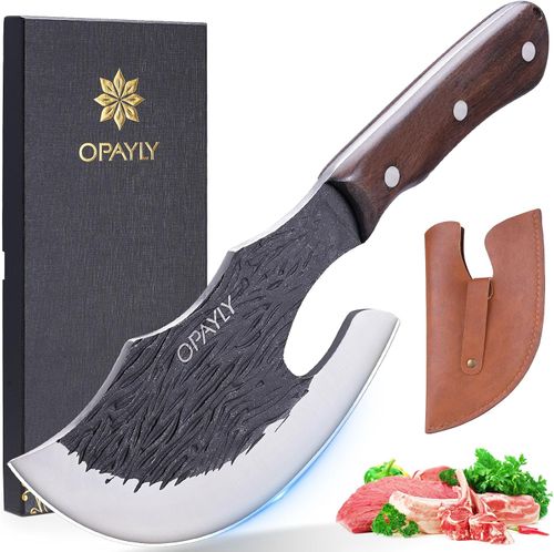 OPAYLY Butcher Meat Cleaver delivers precision chopping power. Hand-forged, high-carbon steel, protective cover—perfect for kitchen, BBQ, or camping. 🔪🥩🔥
