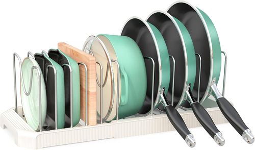 Pantasia Pots and Pans Organizer! 🍽️ It's expandable, has 10 adjustable dividers, and stores lids, cookie sheets, and cutting boards. 🔪