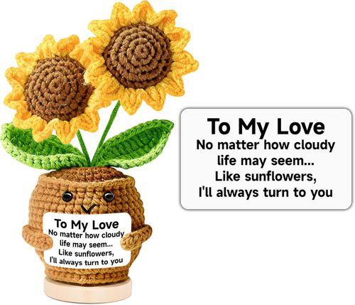 PinCute Crochet Sunflowers make funny, inspirational desk gifts 🌻 Stable base, positive message, perfect for home office decor women men anniversary 🎁.